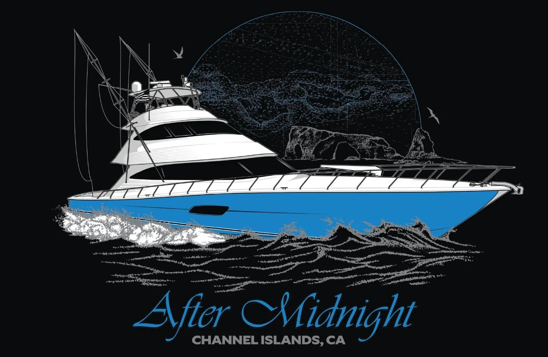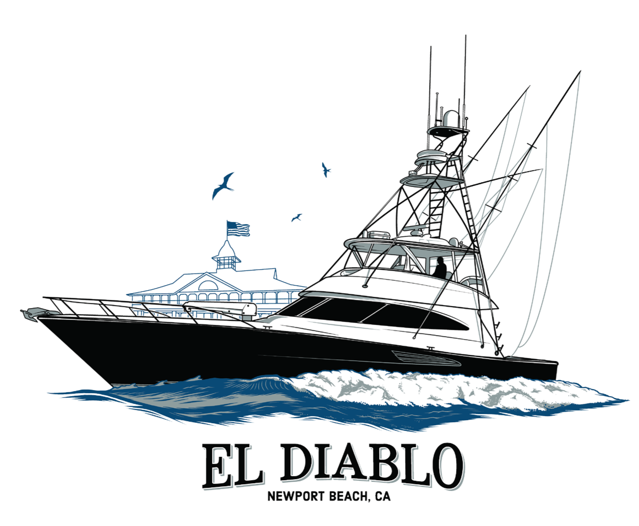 Outline 2: This option covers the basic outline of the vessel, has a white fill and a accent color. There is no shading other than what happens with the black linework. The boats name, and the water is also drawn in.