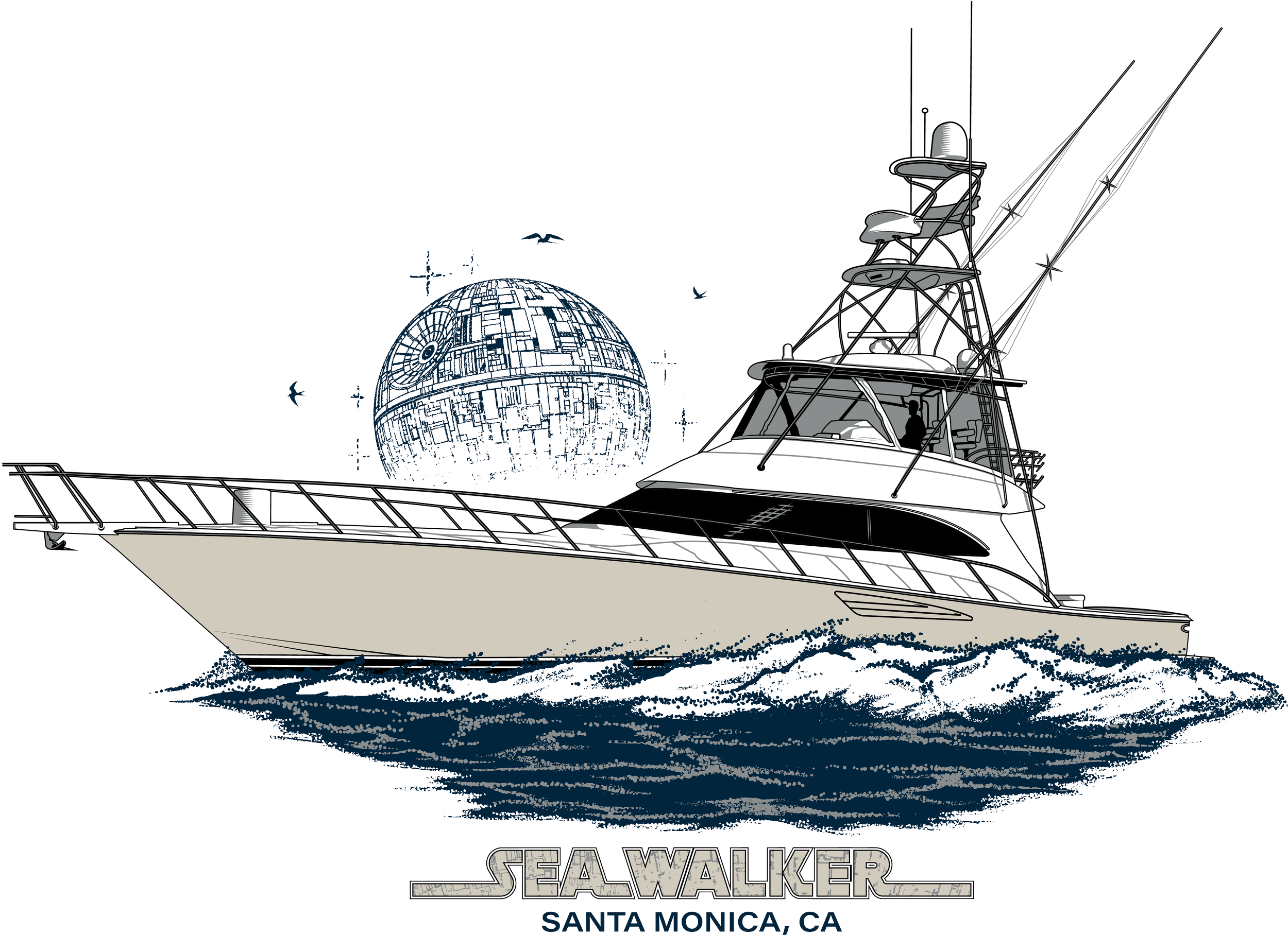 Option 1: This option covers the basic outline of the boat, and has a small amount of detailing. Also included is the water and vessel name. Single color art.