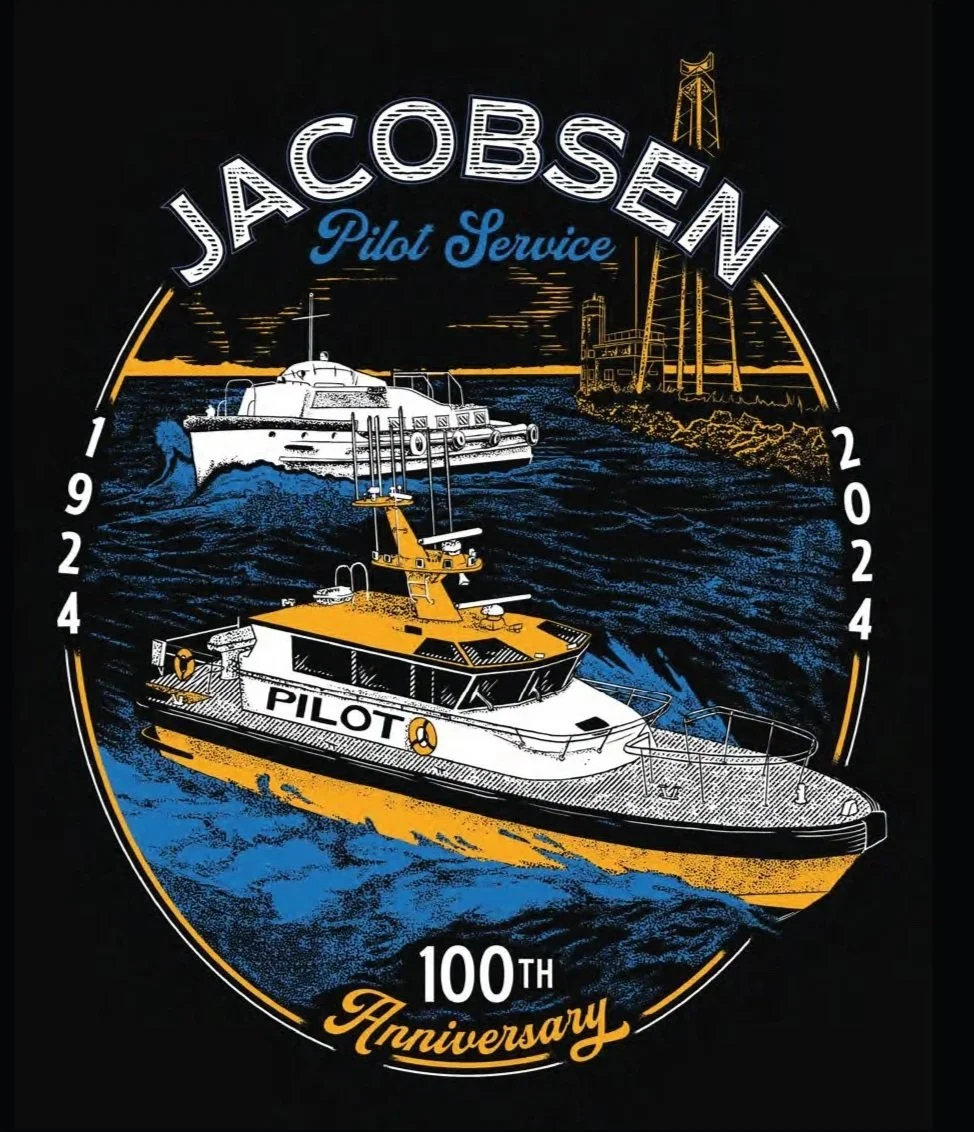 100th Anniversary art for the Jacobsen pilot service. In the background is one of the first boats that was used in service. In the foreground the newer boat is illustrated.