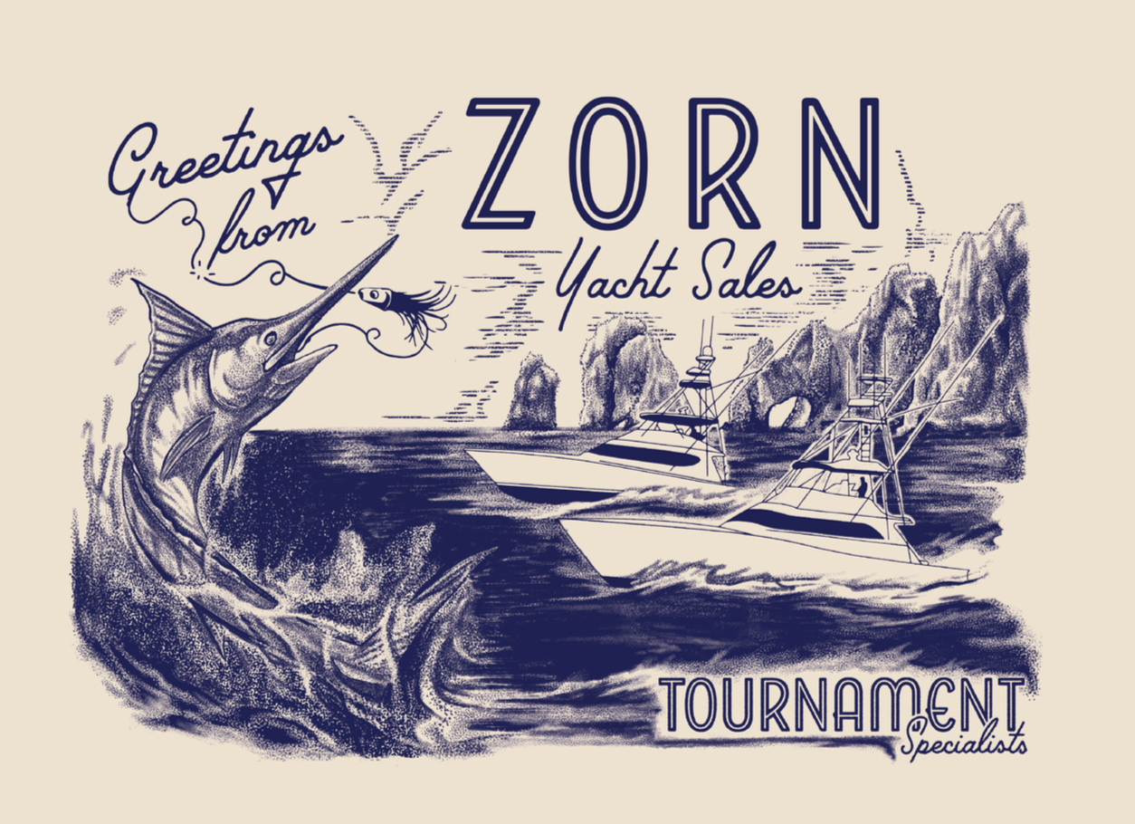 A graphic for Zorn Yacht Sales. They specialize in selling fully outfitted fishing vessels.